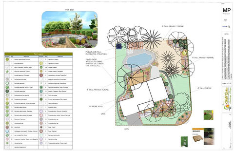Master plans: Drawn to scale, based on your plot plan and our additional measurements. All landscape elements will be drawn to exact placement, botanical plant names, sizes, amount to be planted, hardscape material to be used, size of planting bed, patio, pergola, walks, etc, and additional information such as photos, specifications for installation if needed. This is a highly detailed plan; complete with all plants and hardscape elements included in the drawing. It enables you to see the proposed design plan entirely, do installation in phases, or if the homeowner prefers to do the installation themselves.